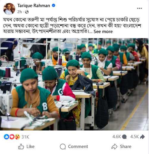 তারেক রহমান বলেন, তৈরি পোশাক শিল্পে কর্মরত দুই-তৃতীয়াংশ শ্রমিক নারী। তাই কর্মজীবী মায়েদের অবদানকে অবমূল্যায়ন করা মানে জাতির অগ্রযাত্রাকে বাধাগ্রস্ত করা।