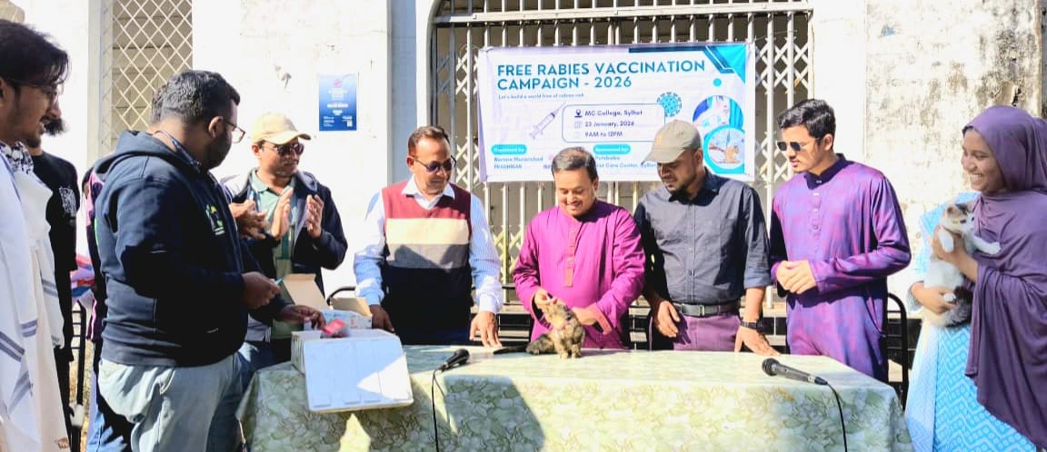 প্রাণীদের প্রতি মমত্ববোধ ও জনসচেতনতা বৃদ্ধির লক্ষ্যে সিলেটের ঐতিহ্যবাহী মুরারিচাঁদ (এমসি) কলেজে বিনামূল্যে জলাতঙ্ক প্রতিরোধ টিকা প্রদান কর্মসূচি অনুষ্ঠিত হয়েছে। শুক্রবার (২৩ জানুয়ারি) সকালে কলেজের কেন্দ্রীয় গ্রন্থাগারের সামনে এ কর্মসূচির আয়োজন করা হয়।
