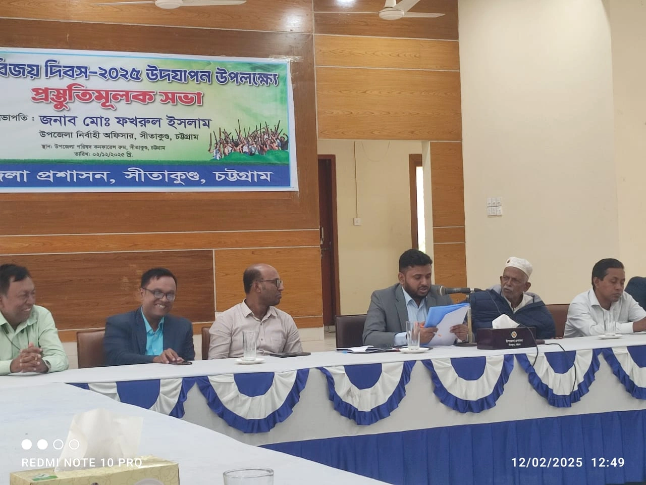 সীতাকুণ্ডে বিজয় দিবস যথাযথ মর্যাদায় পালনের প্রস্তুতি হিসেবে উপজেলা পরিষদ আয়োজিত আলোচনা সভা অনুষ্ঠিত হয়েছে। উপজেলা নির্বাহী কর্মকর্তা মোঃ ফখরুল ইসলামের সভাপতিত্বে মঙ্গলবার, ২ ডিসেম্বর সকাল ১১ টায় উপজেলা হলরুমে সভাটি অনুষ্ঠিত হয়।