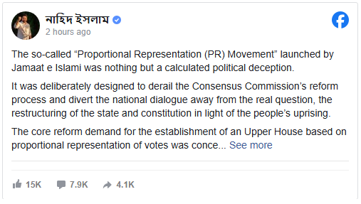 নাহিদ ইসলাম তার পোস্টে উল্লেখ করেন, “ভোটের আনুপাতিক প্রতিনিধিত্বের ভিত্তিতে উচ্চকক্ষ প্রতিষ্ঠার যে মৌলিক সংস্কারের দাবি উঠেছিল, তা ছিল সাংবিধানিক নিরাপত্তার একটি কাঠামো। আমরা সেই ভিত্তিতে একটি বৃহৎ জাতীয় ঐকমত্য গড়ে তুলে জুলাই সনদের আইনি কাঠামো প্রতিষ্ঠা করতে চেয়েছিলাম। কিন্তু জামায়াত ও তার মিত্ররা এই আন্দোলনের লক্ষ্য বিকৃত করে সেটিকে একটি প্রযুক্তিগত ‘পিআর ইস্যু’-তে সীমাবদ্ধ করে ফেলে। তারা এটিকে নিজেদের দলীয় স্বার্থে দর-কষাকষির হাতিয়ার হিসেবে ব্যবহার করেছে। তাদের উদ্দেশ্য কখনোই সংস্কার ছিল না, বরং কৌশলী অপব্যবহার।”