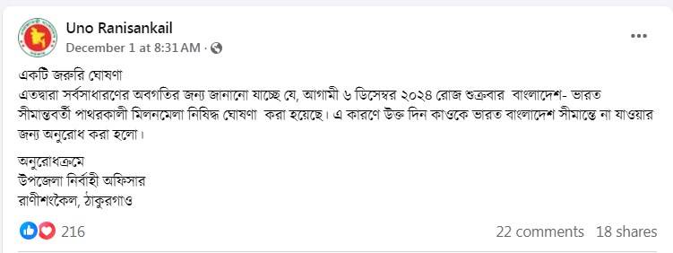 ঘোষণায় জানানো হয়, বাংলাদেশ-ভারত সীমান্তবর্তী পাথরকালী মিলনমেলা নিষিদ্ধ ঘোষণা করা হয়েছে। এ কারণে ওই দিন সেখানে না যাওয়ার জন্য সবার প্রতি অনুরোধ জানানো হয়েছে।