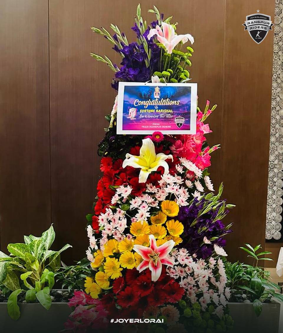 শুভেচ্ছা বার্তার সেই পোস্টে রংপুর লিখেছে, ‘রংপুর রাইডার্সের পক্ষ থেকে নতুন বিপিএল চ্যাম্পিয়ন ফরচুন বরিশালকে ফুলেল শুভেচ্ছা।’ সেখানে দুটি ছবি আপলোড করা হয় যেখানে ছিলেন অধিনায়ক তামিম, মাহমুদউল্লাহ রিয়াদ ও ফরচুন বরিশালের চেয়ারম্যানের সঙ্গে দেখা যায় বড় একটি ফুলের তোড়া। যার মাঝে আবার লেখা ছিল, ‘শিরোপা জয়ের জন্য ফরচুন বরিশালকে অভিনন্দন’।