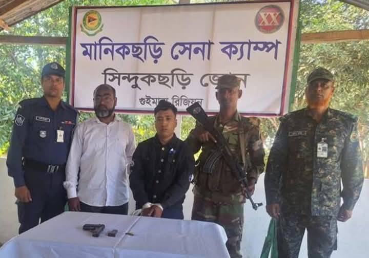 খাগড়াছড়ি জেলার মানিকছড়ি উপজেলার গরমছড়ি এলাকায় যৌথবাহিনীর অভিযানে একটি দেশীয় পিস্তল ও তিন রাউন্ড গুলিসহ অপ্রুচাই মারমা (৩০) নামে এক যুবককে আটক করা হয়েছে।