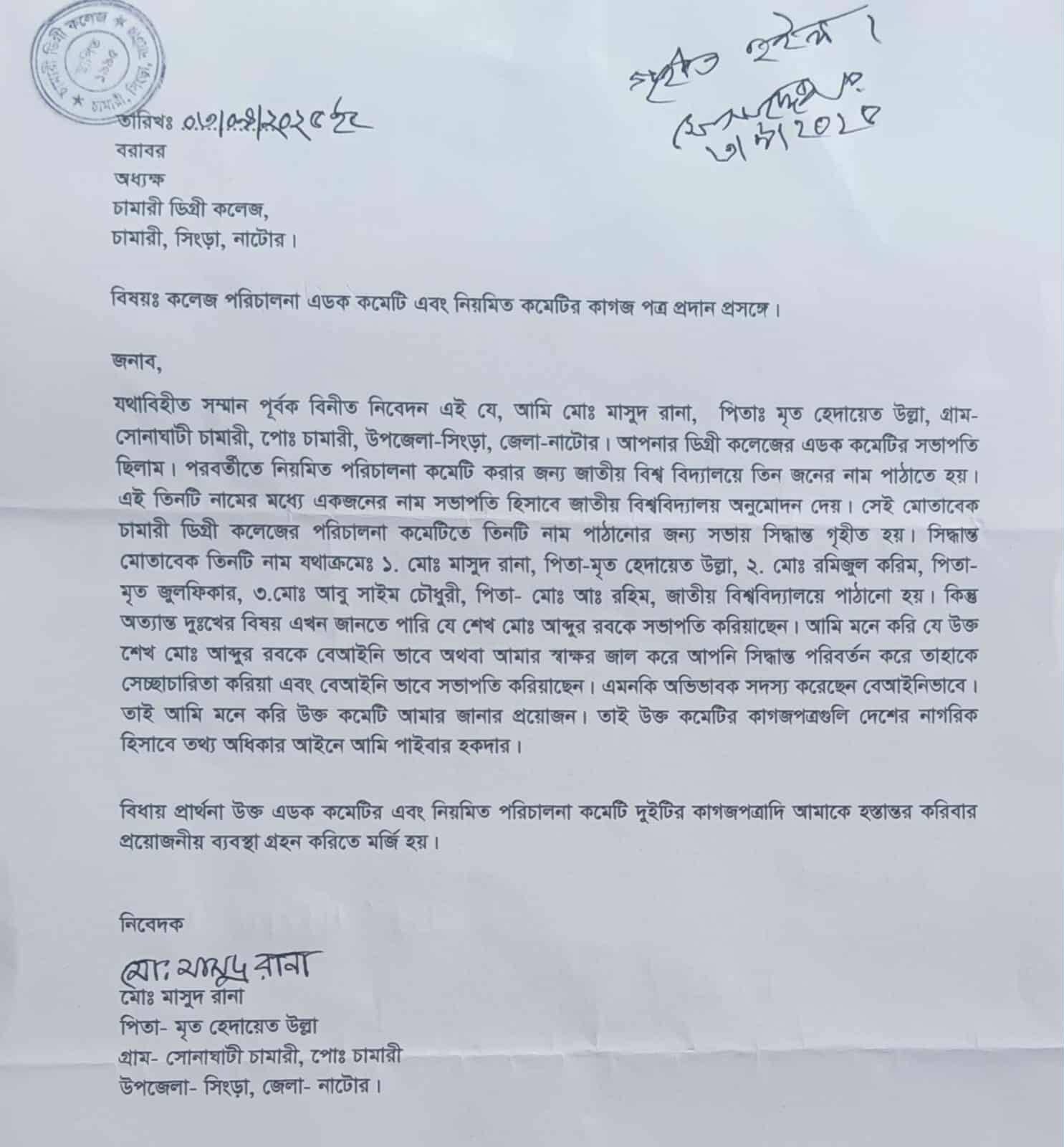 নাটোরের সিংড়া উপজেলার চামারি মহাবিদ্যালয়ের অধ্যক্ষ আসাদুজ্জামানের বিরুদ্ধে অনিয়ম-দুর্নীতি এবং নিয়মবহির্ভূতভাবে রেগুলার কমিটি গঠনের অভিযোগ উঠেছে। অভিযোগ অনুসারে, অধ্যক্ষ গোপনে আব্দুর রবকে সভাপতি করে কমিটি ঘোষণা করেছেন।