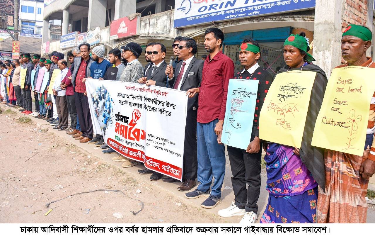 ঢাকায় ‘আদিবাসী’ শিক্ষার্থীদের ওপর বর্বর হামলার প্রতিবাদ এবং হামলাকারীদের অবিলম্বে গ্রেফতার ও বিচারের দাবি জানানো হয়েছে। গাইবান্ধা আদিবাসী-বাঙালি সংহতি পরিষদের এক প্রতিবাদ সমাবেশ থেকে এই দাবি জানানো হয়।