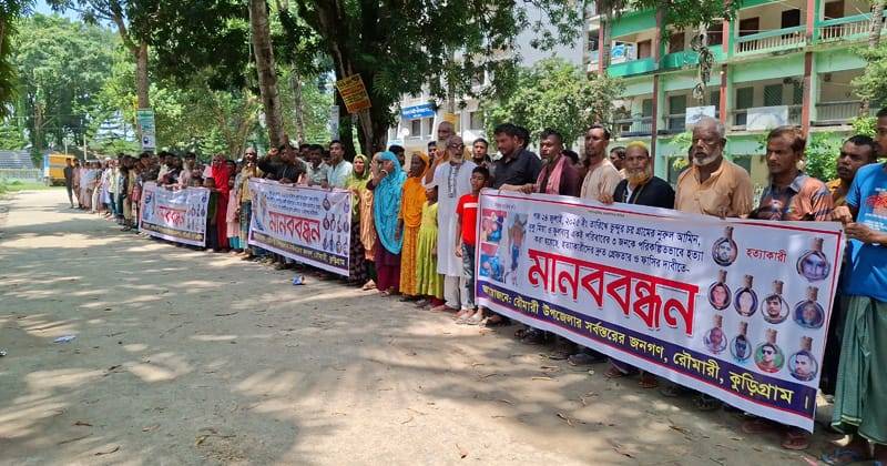 কুড়িগ্রাম জেলার রৌমারী উপজেলার রৌমারী সদর ইউনিয়নের কালোর ও জিঞ্জিরাম নদী দ্বারা বিচ্ছিন্ন সীমান্তবর্তি ভন্দুরচর গ্রামে পরিকল্পিত ভাবে একই পরিবারের তিনজনক হত্যা করা হয় গত ২৪জুলাই। এই ঘটনার প্রতিবাদে হত্যাকারীদের দ্রুত গ্রেফতার ও ফাঁসির দাবীতে মানববন্ধন ও বিক্ষোভ সমাবেশ অনুষ্ঠিত হয়েছে।