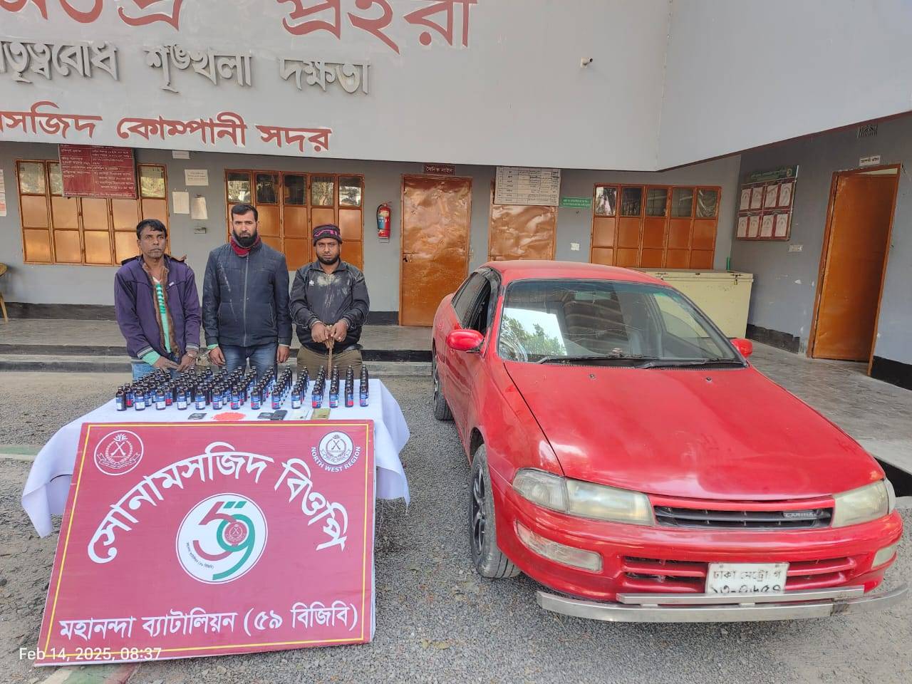 ১৪ ফেব্রুয়ারি ২০২৫ তারিখ ০১:৫০ঘটিকার মধ্যে সোনামসজিদ সীমান্ত দিয়ে বিপুল পরিমাণে মাদকদ্রব্য পাচার হওয়ার সম্ভাবনা রয়েছে। এপ্রেক্ষিতে অত্র ব্যাটালিয়নের অধিনায়ক লেঃ কর্নেল গোলাম কিবরিয়া, বিজিবিএম, বিজিওএম এর পরিকল্পনা ও নির্দেশনায় সোনামসজিদ বিওপিতে কর্মরত নায়েক মোঃ রায়হানুল হক এর নেতৃত্বে ০১টি বিশেষ টহলদল সীমান্ত পিলার ১৮৪/৪-এস হতে আনুমানিক ০৩ কিঃ মিঃ বাংলাদেশের অভ্যন্তরে চাঁপাইনবাবগঞ্জ জেলার শিবগঞ্জ থানাধীন শাহবাজপুর ইউনিয়নের শাহবাজপুর ডিগ্রী কলেজের পার্শ্বে আম বাগানে কৌশলগত অবস্থান নেয়। অতঃপর ০১ জন চোরাকারবারী প্রাইভেট কারযোগে কানসাট হতে সোনামসজিদ যাওয়ার পথে আনুমানিক ০২০০ ঘটিকায় শাহবাজপুর ডিগ্রী কলেজের সামনে মাদক নেওয়ার উদ্দেশ্যে থামলে টহলদল ৯৮ বোতল ভারতীয় ফেন্সিডিল, ৩৮০ পিস ইয়াবা, ০৩টি ব্যবহৃত মোবাইল ফোন এবং ০১টি প্রাইভেট কারসহ (TOYATA SX CARINA) নিম্নবর্ণিত ০৩ জন চোরাকারবারীকে আটক করতে সক্ষম হয়। মালামালসহ আটককৃত চোরাকারবারীদেরকে শিবগঞ্জ থানায় হস্তান্তরের কার্যক্রম চলমান রয়েছে।