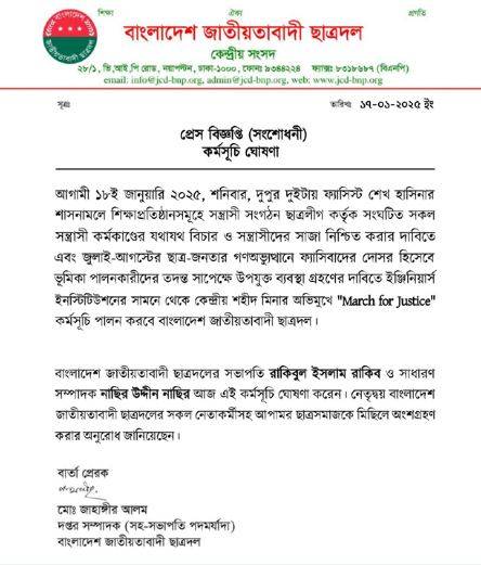 বাংলাদেশ জাতীয়তাবাদী ছাত্রদল আজ দুপুর ২টায় ‘মার্চ ফর জাস্টিস’ কর্মসূচি পালন করবে। কর্মসূচিটি রাজধানীর ইঞ্জিনিয়ার্স ইনস্টিটিউশনের সামনে থেকে শুরু হয়ে কেন্দ্রীয় শহীদ মিনারে গিয়ে শেষ হবে।