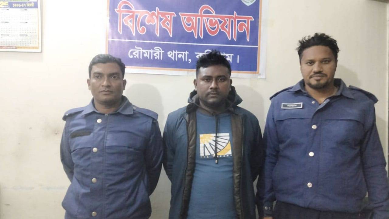 গত শুক্রবার (১৭ জানুয়ারি) রাত সাড়ে ৯টায় উপজেলার দাঁতভাঙ্গা বাজারের একটি চায়ের দোকান থেকে তাকে গ্রেপ্তার করা হয়। শনিবার (১৮ জানুয়ারি) গ্রেপ্তারের বিষয়টি নিশ্চিত করেছেন রৌমারী থানার অফিসার ইনচার্জ মোঃ লুৎফর রহমান।