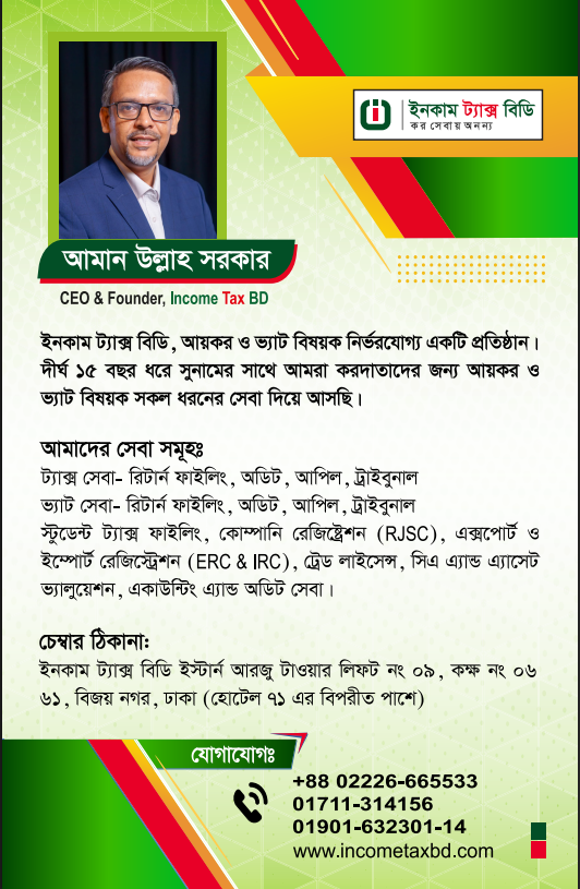 দীর্ঘ ১৫ বছরের অভিজ্ঞতা ও সুনামের সাথে ইনকাম ট্যাক্স বিডি করদাতাদের জন্য আয়কর ও ভ্যাট সংক্রান্ত সব ধরনের পেশাদার সেবা প্রদান করে আসছে।