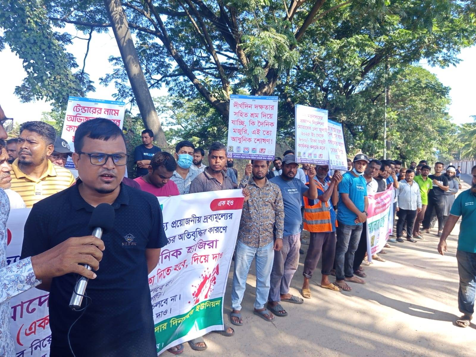 ইস্টার্ন রিফাইনারিতে নিযুক্ত ঠিকাদার দিন মজুর শ্রমিক ইউনিয়ন (রেজিঃ ১০২২) এর সভাপতি মোঃ জামাল উদ্দিনের সভাপতিত্বে অনুষ্ঠিত অবস্থান কর্মসূচির প্রতিবাদ সমাবেশে বক্তব্য রাখেন সাধারণ সম্পাদক মোঃ আলমগীর হোসেন জুয়েল, প্রবীণ শ্রমিক কর্মচারীদের নেতা মোঃ জাহাঙ্গীর আলম, মোঃ দেলোয়ার হোসেন, মোঃ আরাফাত রহমান, আনোয়ার হোসেন, মোঃ মিজান, মোঃ সালাউদ্দিন, মোঃ শফি, মোঃ ফারুক, কফিল উদ্দিন, নয়ন, হেলাল উদ্দিন, মোঃ সোহেল, মোঃ ফাহিম, মোঃ মামুন, মোঃ ইলিয়াছ,আখিল, সালাউদ্দিন আহমেদ, কবির হোসেন সহ পদ্মা, মেঘনা, যমুনা ও এলপিজি লিঃ কারখানার শ্রমিকরা বিক্ষোভ সমাবেশ এবং অবস্থান কর্মসূচিতে অংশ নেন। এসময় তারা প্রতিবাদ জানিয়ে বলেন, অর্থমন্ত্রণালয়ের নির্দেশক্রমে ৮০০ টাকা ন্যায্য মজুরি কাঠামো , দুই ঈদের উৎসব ভাতা সহ দেশের নিত্যপণ্যের উর্ধ্বগতি ও গ্যাস - বিদ্যুৎ, পানির দাম, শিক্ষা ও স্বাস্থ্যখাতে ব্যয়ে শ্রমিকরা চরমভাবে ক্ষতিগ্রস্ত হচ্ছে। এছাড়া তেল সেক্টরে ট্রেন্ডার নিয়ে তালবাহনা এবং ১০২২ টাকার পরিবর্তে ১০৫০ দিন মজুরী নির্ধারণ করতে জোর দাবি জানান।