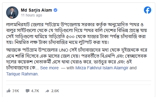 গত ২ জুলাই (বুধবার) দিবাগত রাত ১টা ১৩ মিনিটে প্রকাশিত ওই স্ট্যাটাসে সারজিস লিখেন, “সরকার অনুমোদিত পাথর ও বালুর সাইটগুলো থেকে পণ্য বহনকারী যানবাহনগুলো থামিয়ে প্রতিটি গাড়ি থেকে ৫০০ থেকে ১,০০০ টাকা পর্যন্ত চাঁদা আদায় করা হচ্ছে। এটি এখন নিয়মিত ঘটনায় পরিণত হয়েছে। লাখ লাখ টাকা লুটপাট চলছে ‘চাঁদাবাজি’র নামে।”