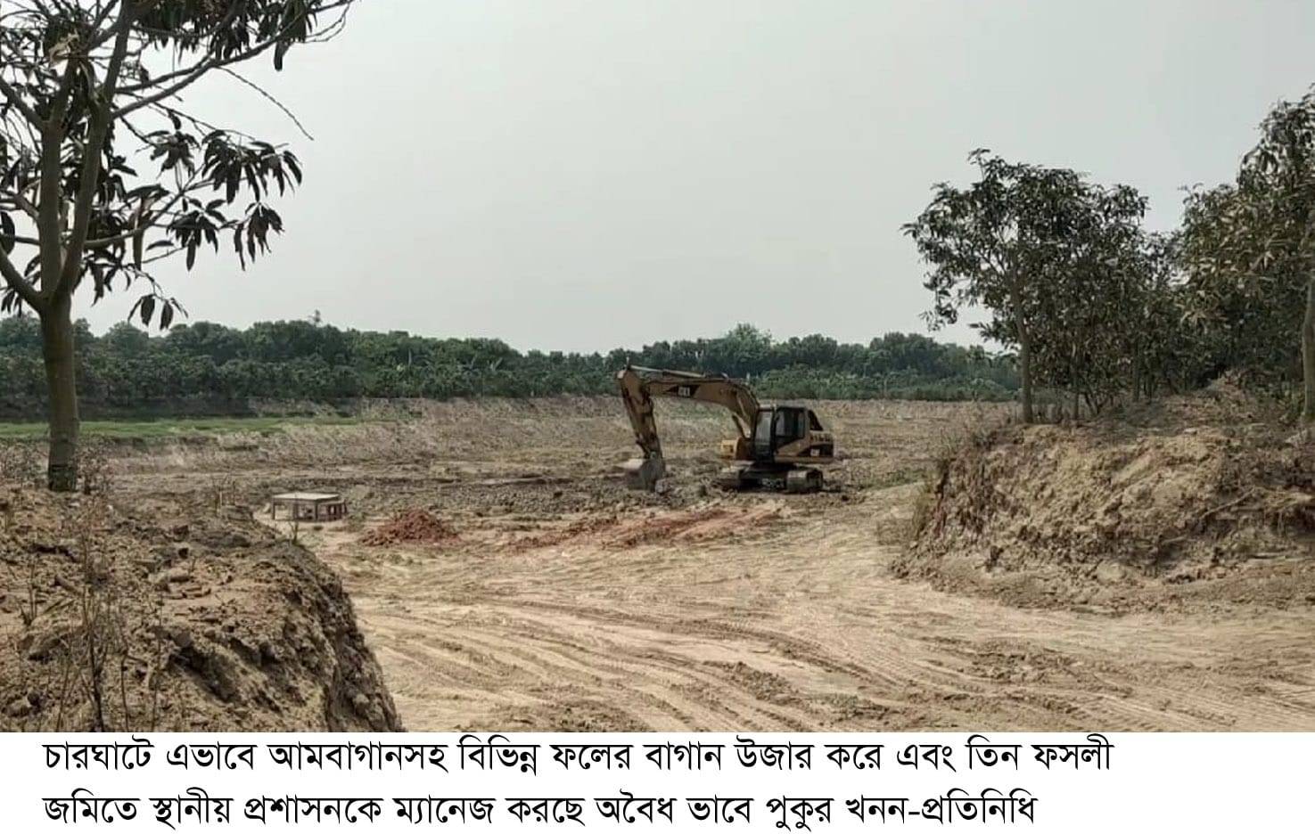 জানা গেছে, গত কয়েক বছর ধরে চারঘাটে স্থানীয় প্রশাসনকে ম্যানেজ করে দিনের পর দিন, মাসের পর মাস, বছরের পর বছর ধরে আমের বাগানসহ বিভিন্ন ধরণের ফলের বাগান উজার করে চলছে পুকুর খনন। বাগান ছাড়াও তিন ফসলী জমিতে একের পর এক পুকুর খনন কাজ চলে আসলেও চোখে কালো চশমা পড়ে থাকছেন স্থানীয় প্রশাসন। অভিযোগ চারঘাটের ক্ষতিগ্রস্থ কৃষকদের। স্থানীয় কৃষকদের অভিযোগ অবৈধ পুকর খনন বন্ধে এবং কৃষি জমি রক্ষার্থে স্থানীয় প্রশাসনকে লিখিত ও মৌখিক ভাবে একাধিকবার অভিযোগ দিলেও বন্ধ হয়নি পুকুর খনন। অবৈধ পুকুর খনন চক্রের সদস্যরা স্থানীয় প্রশাসনকে ম্যানেজ করে বিভিন্ন রাজনৈতিক নেতৃবৃন্দের সঙ্গে আতাত করে প্রকাশ্যে চালাচ্ছেন তাদের অবৈধ কর্মকান্ড। প্রশাসনের নেই কোন নজরদারী।