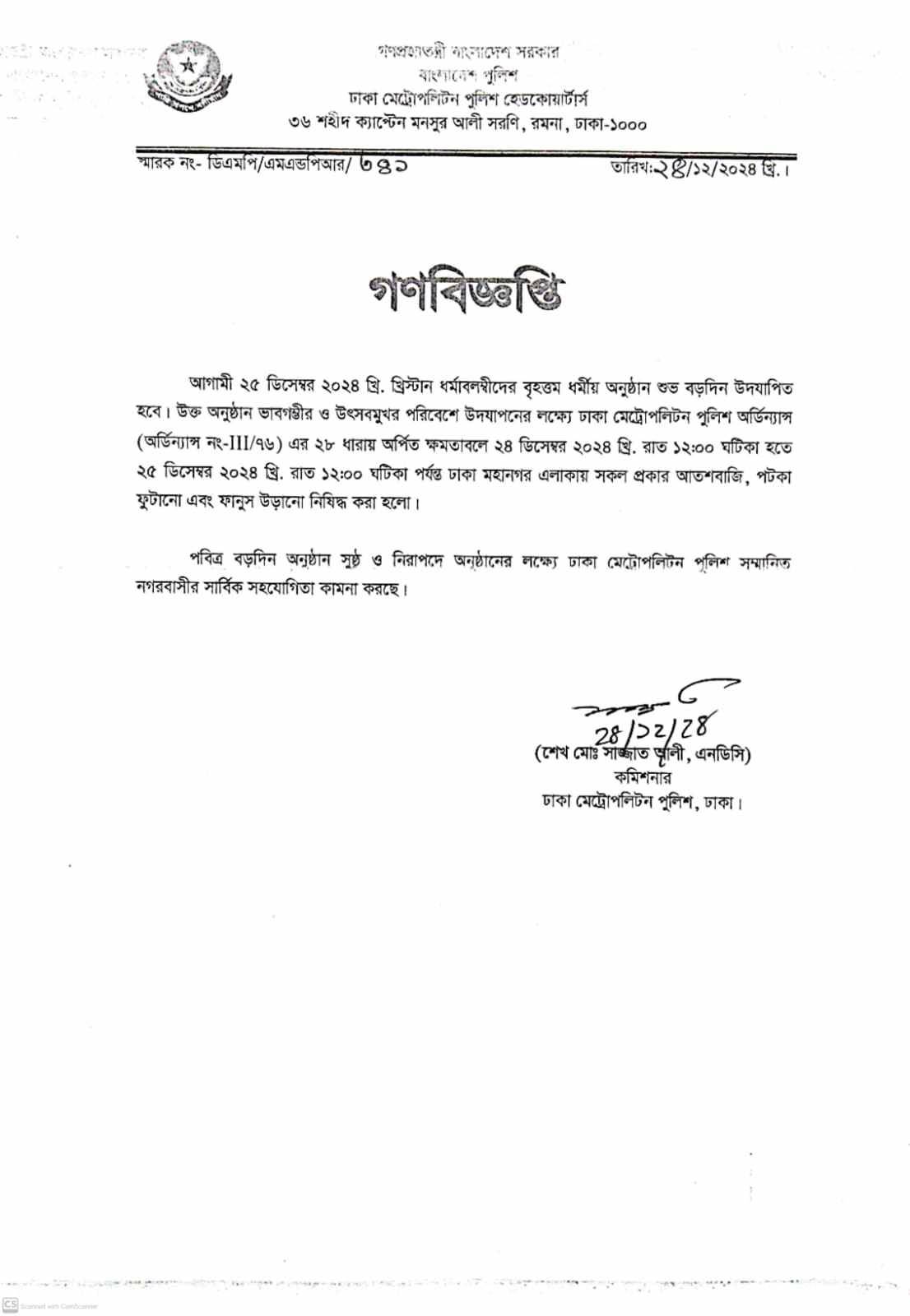 বিজ্ঞপ্তিতে বলা হয়, খ্রিস্টান ধর্মাবলম্বীদের এই বৃহত্তম ধর্মীয় উৎসবটি ভাবগম্ভীর ও উৎসবমুখর পরিবেশে উদযাপন নিশ্চিত করতে ২৪ ডিসেম্বর রাত ১২টা থেকে ২৫ ডিসেম্বর রাত ১২টা পর্যন্ত ঢাকা মহানগর এলাকায় সব ধরনের আতশবাজি, পটকা ফোটানো ও ফানুস ওড়ানো নিষিদ্ধ থাকবে।