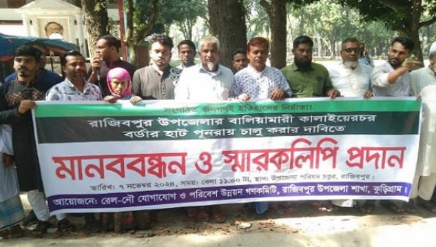 রাজীবপুর উপজেলা রেল-নৌ যোগাযোগ ও পরিবেশ উন্নয়ন গণকমিটির আহ্বায়ক রবিউল ইসলামের সঞ্চালনায় অনুষ্ঠিত মানববন্ধনে বক্তব্য দেন কমিটির সদস্যসচিব শিপন মাহমুদ, রাজীবপুর উপজেলা রাষ্ট্র সংস্কার আন্দোলনের আহ্বায়ক আবু সাঈদ, সদস্যসচিব সুমন মাহমুদ, ভূমিহীন সমিতির সভাপতি আবদুর রশিদ, ফরিদ উদ্দিন ডিলার, সাংবাদিক মাইদুল ইসলাম, লিটন মিয়া প্রমুখ।