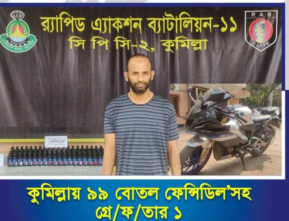 কুমিল্লায় ৯৯ বোতল ফেন্সিডিল’সহ একজন মাদক ব্যবসায়ীকে গ্রেফতার করেছে র্যাব-১১, সিপিসি-২।
