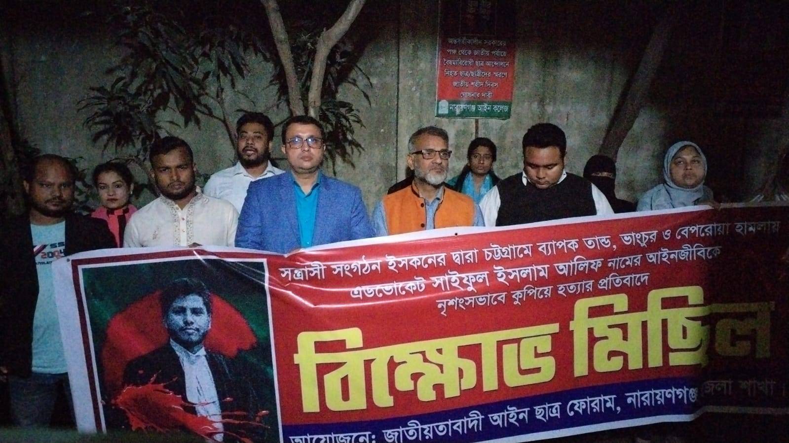 নারায়ণগঞ্জ জেলা জাতীয়তাবাদী আইন কলেজ শাখার মো সাদ্দাম হোসেনের সভাপতিত্বে প্রতিবাদ সভা ও দোয়া আলোচনায় উপস্থিত ছিলেন আইন কলেজের প্রিন্সিপাল নারায়ণগঞ্জ জজ কোর্ট এডভোকেট সাখাওয়াত হোসেন ভূঁইয়া বলেন চট্রগ্রামের এডভোকেট হত্যা কখনোই ছোট করে দেখার অবকাশ নেই উগ্রবাদী সন্ত্রাসী ইসকন পরিকল্পিত ভাবে এই হত্যাকান্ড চালিয়েছে। তিনি আরো বলেন অলি আউলিয়া গাউস কুতুবের বাংলাদেশে কোন সন্ত্রাসী উগ্রবাদী ইসকনের যায়গা হতে পারেনা।