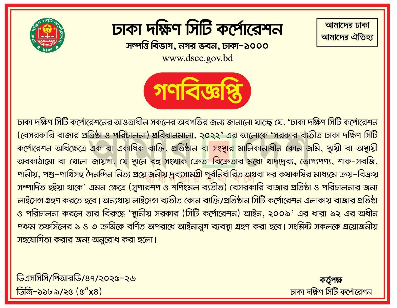 লাইসেন্সবিহীন বেসরকারি বাজারের বিরুদ্ধে ব্যবস্থা গ্রহণের বিষয়ে দক্ষিণ সিটি কর্পোরেশনের গণবিজ্ঞপ্তি: