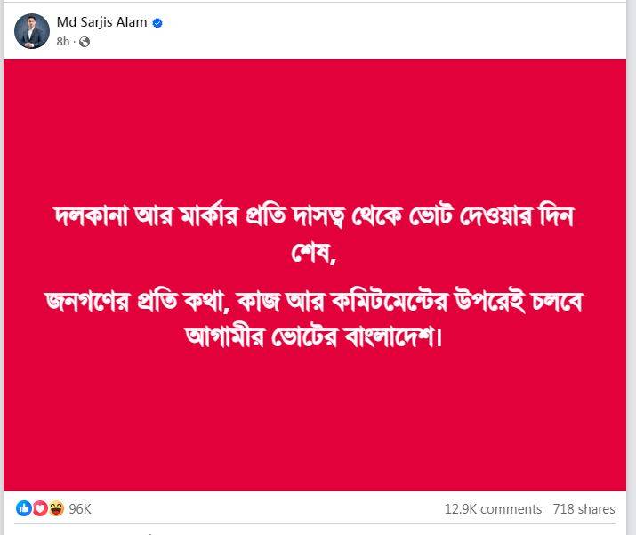 জাতীয় নাগরিক পার্টির (এনসিপি) উত্তরাঞ্চলের মুখ্য সংগঠক সারজিস আলম বলেছেন, “মার্কার প্রতি অন্ধ আনুগত্য থেকে ভোট দেওয়ার দিন শেষ। এখন থেকে ভোট হবে প্রতিশ্রুতি, কাজ ও জনগণের প্রতি দায়বদ্ধতার ভিত্তিতে।”