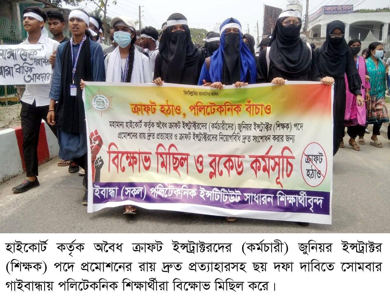 হাইকোর্ট কর্তৃক অবৈধ ক্রাফট ইন্সট্রাক্টরদের (কর্মচারী) জুনিয়র ইন্সট্রাক্টর (শিক্ষক) পদে প্রমোশনের রায় দ্রুত প্রত্যাহারসহ ছয় দফা দাবিতে সোমবার গাইবান্ধায় পলিটেকনিক শিক্ষার্থীরা বিক্ষোভ মিছিল ও অবস্থান কর্মসূচি পালন করে। গাইবান্ধা সকল পলিটেকনিক ইন্সটিটিউটের সাধারণ শিক্ষার্থীবৃন্দ এই কর্মসূচির আয়োজন করে। বিড়্গোভ মিছিলটি গাইবান্ধা পলিটেকনিক ইন্সটিটিউট চত্বর থেকে বের হয়ে শহরের প্রধান প্রধান সড়ক প্রদক্ষিণ করে। শহরের ১নং রেলগেট এলাকায় অবস্থান কর্মসূচি চলাকালে বক্তব্য দেন পলিটেকনিক ইন্সটিটিউটের শিক্ষার্থী শাকিল আহাম্মেদ, নাজমুল ইসলাম,বাধন, মেহেজাবিন জিম প্রমুখ।