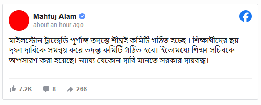পোস্টে মাহফুজ আলম লেখেন, “মাইলস্টোন ট্রাজেডির পূর্ণাঙ্গ তদন্তের লক্ষ্যে শিগগিরই একটি তদন্ত কমিটি গঠন করা হবে। শিক্ষার্থীদের উত্থাপিত ছয়টি দাবির সঙ্গে সমন্বয় রেখেই এই কমিটি কাজ করবে। ইতোমধ্যে শিক্ষা সচিবকে দায়িত্ব থেকে অব্যাহতি দেওয়া হয়েছে। সরকার ন্যায্য যেকোনো দাবি মেনে নিতে প্রতিশ্রুতিবদ্ধ।”