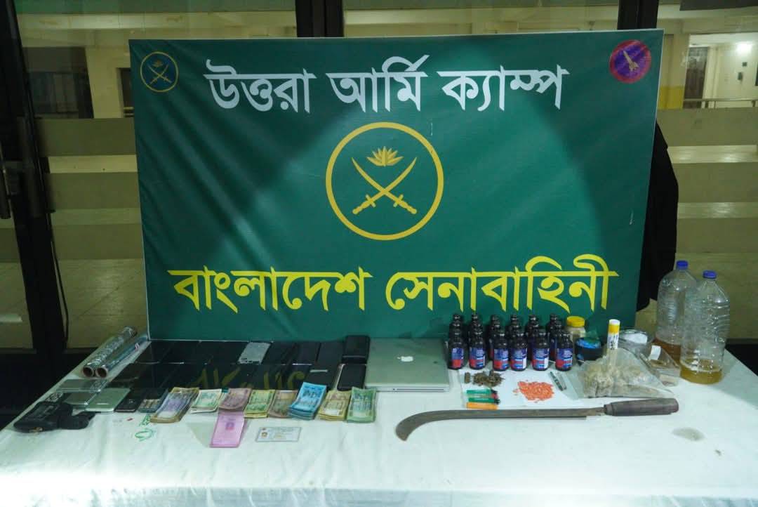 উক্ত অভিযানে উত্তরা আর্মি ক্যাম্প কর্তৃক উল্লেখযোগ্য পরিমাণ ইয়াবা, ফেনসিডিল, গাঁজা, দেশীয় মদ, মরিয়ম ফুল, ১৭ টি মোবাইল এবং অবৈধ নগদ টাকাসহ চিহ্নিত মাদক ব্যবসায়ী প্রদীপ চন্দ্র বর্মন এবং তার ০৩ জন সহযোগী মিরাজ, কিফায়াত উল্লাহ ও শামীমকে গ্রেফতার করা হয়। আটকৃতদেরকে প্রয়োজনীয় জিজ্ঞাসাবাদ এবং পরবর্তী আইনি কার্যক্রম সম্পন্নের জন্য টঙ্গী পূর্ব থানা পুলিশের নিকট হস্তান্তর করা হয়েছে।