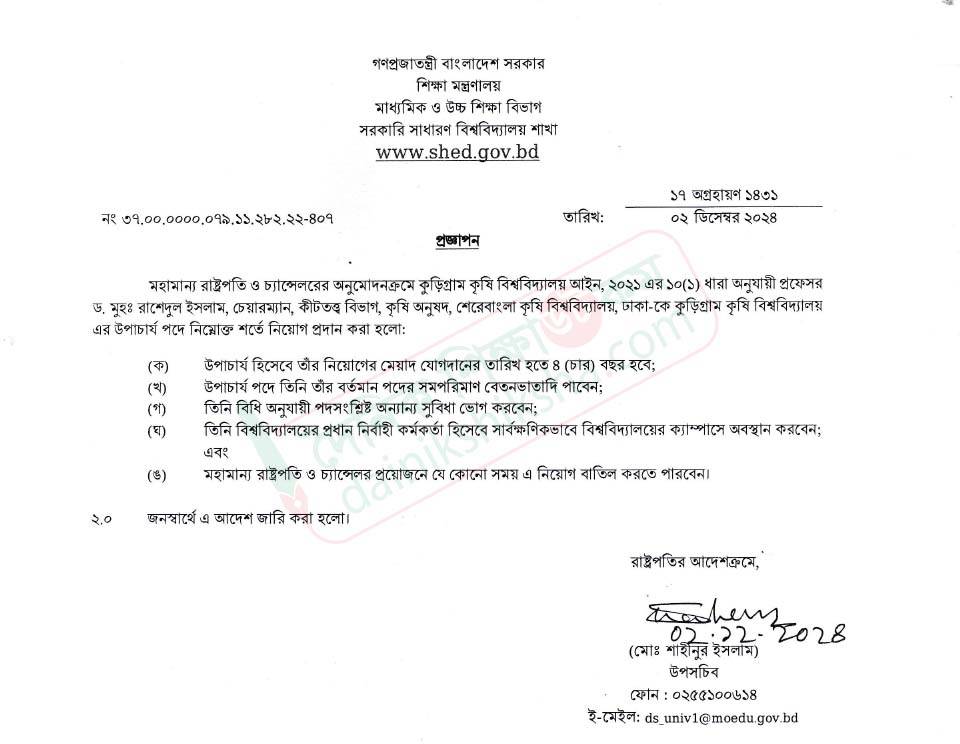কুড়িগ্রাম কৃষি বিশ্ববিদ্যালয়ের উপাচার্য পদে নিয়োগ পেয়েছেন শেরেবাংলা কৃষি বিশ্ববিদ্যালয়ের (শেকৃবি) কৃষি অনুষদের কীটতত্ত্ব বিভাগের চেয়ারম্যান প্রফেসর ড. রাশেদুল ইসলাম। সোমবার শিক্ষা মন্ত্রণালয়ের এক প্রজ্ঞাপনে এ নিয়োগের কথা বলা হয়।