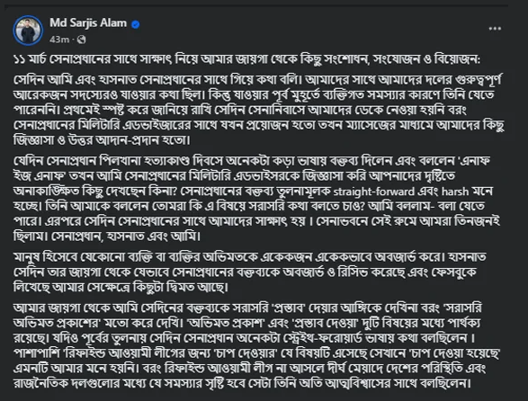 অন্তর্বর্তীকালীন সরকারের সময়, দেশের সার্বিক পরিস্থিতি নিয়ে বাংলাদেশ সেনাবাহিনীর সাথে অন্যান্য রাজনৈতিক দলগুলোর যোগাযোগ রক্ষা করা হয়ে থাকে। আমাদের সেদিন সেনাপ্রধানের সঙ্গে যেসব বিষয় নিয়ে আলোচনা হয়েছে, তা নিয়ে আমরা দলের ফোরামে আলোচনা করে সিদ্ধান্ত নিতে পারতাম। তবে, ফেসবুকে বিষয়গুলো প্রকাশ করা আমাদের জন্য অনুচিত মনে হয়েছে, কারণ এতে পরবর্তীতে গুরুত্বপূর্ণ আলোচনায় আস্থা সংকট দেখা দিতে পারে।
