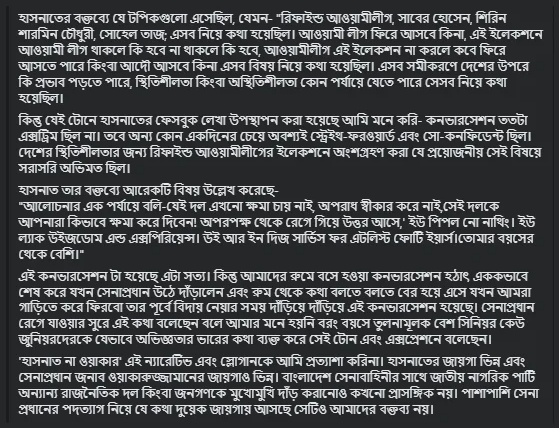 হাসনাতের ফেসবুক স্ট্যাটাসে যে বিষয়গুলো এসেছে, যেমন “রিফাইন্ড আওয়ামী লীগ, সাবের হোসেন, শিরিন শারমিন চৌধুরী, সোহেল তাজ” ইত্যাদি, সেগুলোর মধ্যে আলোচনা হয়েছিল। তবে, আমি মনে করি, এই কনভারসেশনটি ততটা এক্সট্রিম ছিল না। তবে, অন্য যে কোনো দিনের তুলনায়, এটি অনেকটা সরাসরি এবং আত্মবিশ্বাসী ছিল।