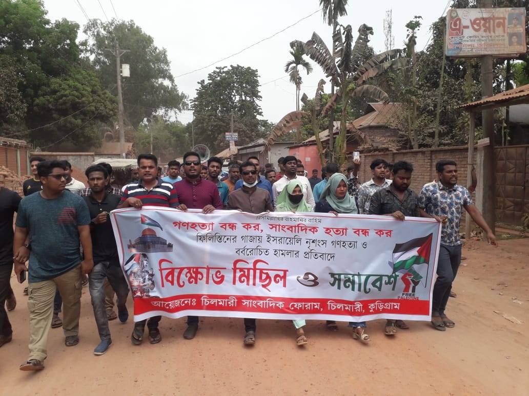কুড়িগ্রামের চিলমারীতে "সাংবাদিক ফোরামের" আয়োজনে ফিলিস্তিনের গাজায় ইসরায়েলি নৃশংস গণহত্যা ও বর্বরোচিত হামলার প্রতিবাদে বিক্ষোভ মিছিল ও সমাবেশ অনুষ্ঠিত হয়েছে।