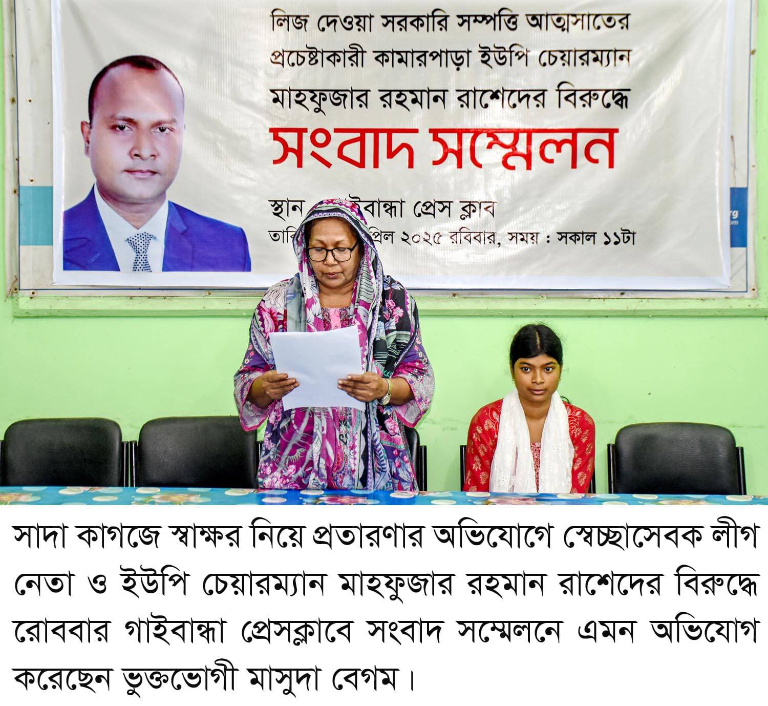 গাইবান্ধায় সাদা কাগজে স্বাক্ষর নিয়ে আপন খালার সঙ্গে প্রতারণার অভিযোগ উঠেছে জেলা স্বেচ্ছাসেবক লীগ নেতা ও ইউপি চেয়ারম্যান মাহফুজার রহমান রাশেদের বিরুদ্ধে। রোববার বেলা ১১টার দিকে গাইবান্ধা প্রেসক্লাবে সংবাদ সম্মেলনে এমন অভিযোগ করেছেন ভুক্তভোগী মাসুদা বেগম।