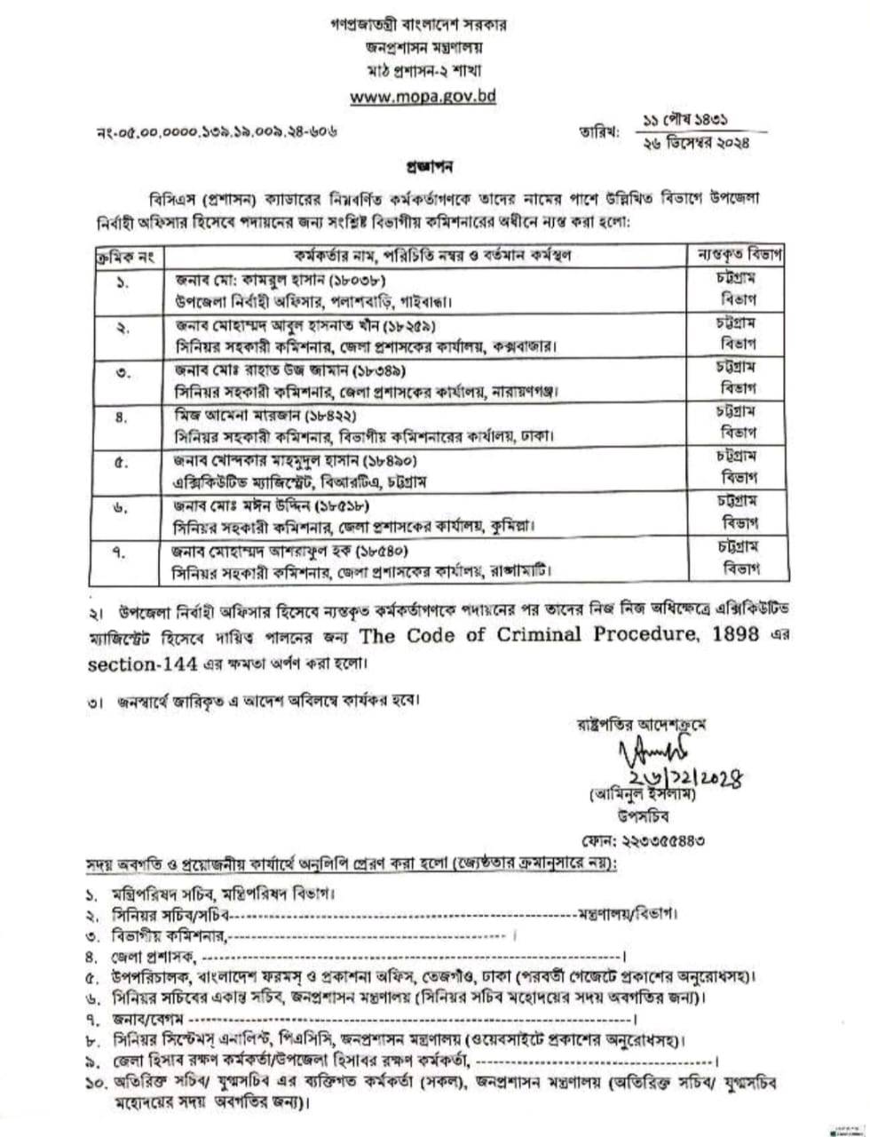 জানাযায়,২৬ ডিসেম্বর বৃহস্পতিবার জনপ্রশাসন মন্ত্রণালয়ের মাঠ প্রশাসন ২ শাখার উপসচিব আমিনুল ইসলাম মহামান্য রাষ্ট্রপতির আদেশ ক্রমে তাকে বদলি করেন।