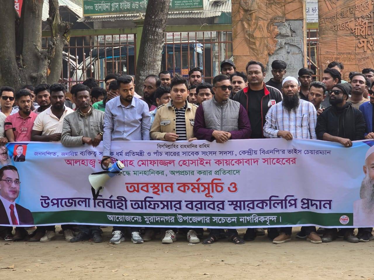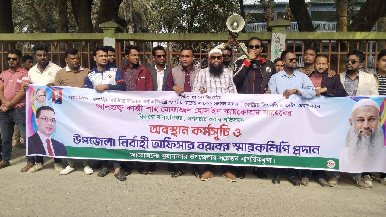 কুমিল্লা-৩ (মুরাদনগর) আসনের পাঁচবারের নির্বাচিত সাবেক সংসদ সদস্য ও বিএনপির নির্বাহী কমিটির ভাইস চেয়ারম্যান কাজী শাহ্ মোফাজ্জল হোসাইন কায়কোবাদের বিরুদ্ধে সামাজিক যোগাযোগ মাধ্যম ফেসবুকে মিথ্যা অপপ্রচার ও ভুয়া কল রেকর্ড প্রচারের প্রতিবাদে অবস্থান কর্মসূচি পালন করা হয়েছে।