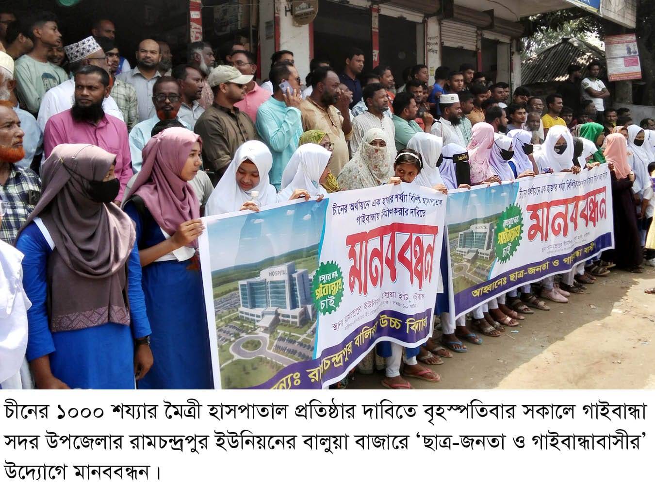বক্তারা বলেন, ৩১ বিঘা জমির ওপর প্রতিষ্ঠিত রামচন্দ্রপুর হাসপাতালটি অকেজো অবস্থায় পড়ে রয়েছে। এখানে সুযোগ-সুবিধা থাকার পরেও অজ্ঞাত কারণে হাসপাতালটি সচল করা হচ্ছে না। চীনের মৈত্রী হাসপাতালটি প্রতিষ্ঠার জন্য এলাকার লোকজন প্রয়োজনে আরও জমি দানে রাজি রয়েছেন। এই জায়গায় চীনের ১০০০ শয্যার হাসপাতালটি প্রতিষ্ঠিত হলে গোটা রংপুর বিভাগের মানুষ উপকৃত হবে। বক্তারা রংপুরের পরিবর্তে গাইবান্ধার রামচন্দ্রপুরের বালুয়া হাসপাতালটি প্রতিষ্ঠার উদ্যোগ গ্রহণের দাবি জানান।