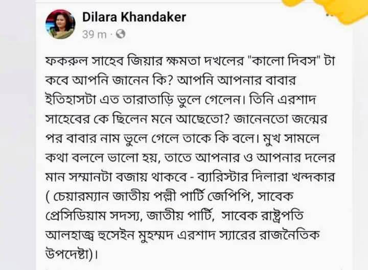 ২৪ জুন মঙ্গলবার ব্যারিষ্টার দিলারা খন্দকার শিল্পী তার ফেসবুক পোস্টে বিএনপি মহাসচিব মির্জা ফখরুল ইসলাম আলমগীরকে উদ্দেশ্য করে যা লিখেছেন তা হুবহু তুলে ধরা হলো--ফখরুল সাহেব জিয়ার ক্ষমতা দখলের কালো দিবসটা আপনি জানেন কি? আপনি আপনার বাবার ইতিহাসটা এত তারাতারি ভুলে গেলেন। তিনি এরশাদ সাহেবের কি ছিলেন মনে আছে তো?জানেন তো জম্নের পর বাবার নাম ভুলে গেলে তাকে কি বলে।মুখ সামলে কথা বললে ভালো হয়।তাতে আপনার ও আপনার দলের সম্মানটা ভালো থাকবে- (ব্যারিস্টার দিলারা খন্দকার শিল্পী চেয়ারম্যান জাতীয় পল্লী পার্টি জেপিপি,সাবেক প্রেসিডিয়াম সদস্য জাতীয় পার্টি,সাবেক রাষ্ট্রপতি হুসাইন মোহাম্মাদ এরশাদ স্যারের রাজনৈতিক উপদেষ্টা)।