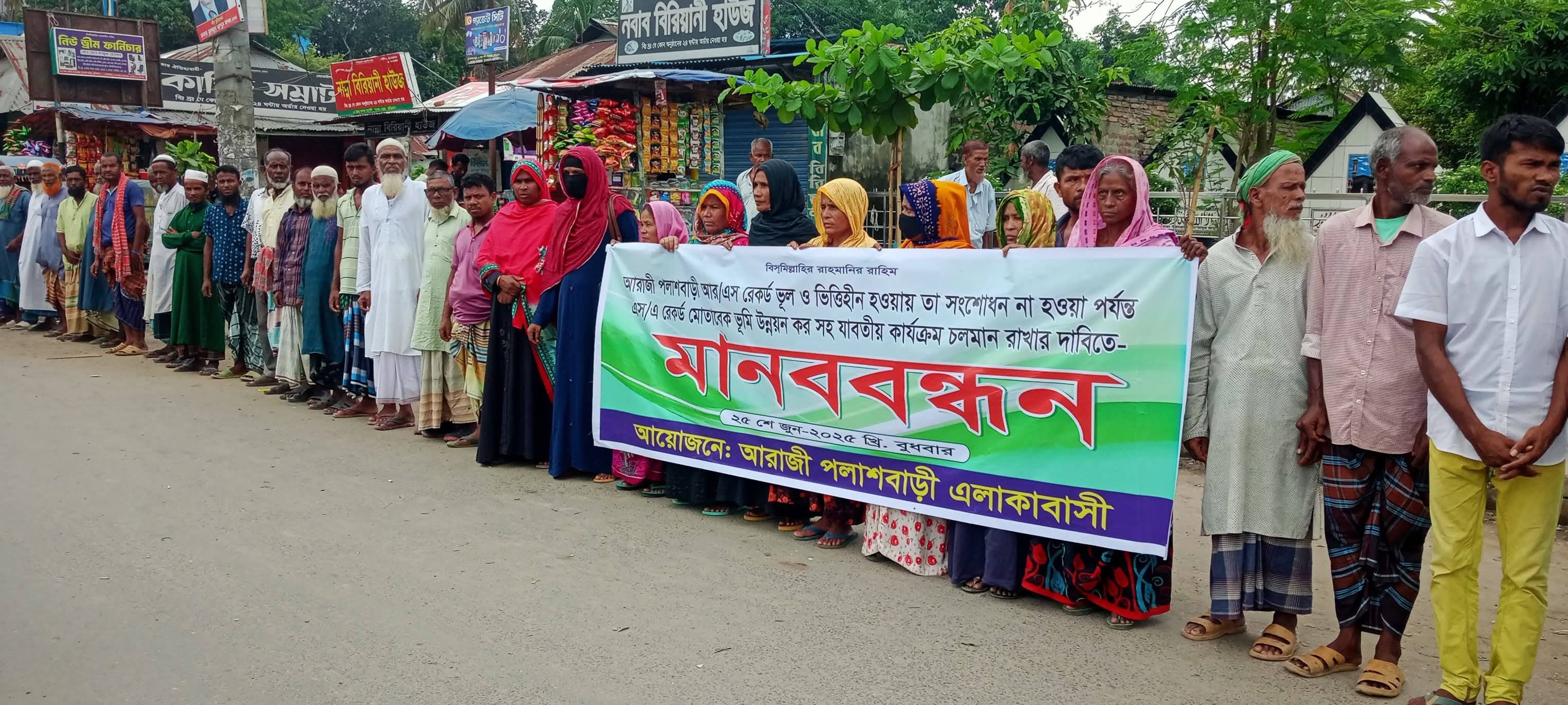 কুড়িগ্রাম জেলা সদর উপজেলার আরাজী পলাশবাড়ী এলাকায় আর.এস রেকর্ড ভুল ও ভিত্তিহীন হওয়ায় তা সংশোধন না হওয়া পর্যন্ত এস.এ রেকর্ড মোতাবেক ভূমি উন্নয়ন কর সহ যাবতীয় কার্যক্রম চলমান রাখার দাবিতে ২৫ জুন’ ২০২৫ইং বুধবার দুপুরে কুড়িগ্রাম জেলা শহরের কেন্দ্রীয় শহীদ মিনার সংলগ্ন শাপলা চত্ত্বর এলাকায় আরাজী পলাশবাড়ী এলাকাবাসী এক মানববন্ধন কর্মসূচী পালন করে। পরে আরাজী পলাশবাড়ী এলাকার স্থানীয় কৃষক-কৃষাণী মিছিল যোগে জেলা প্রশাসকের কার্যালয়ে এসে প্রশাসনের কাছে বিষয়টি তুলে ধরেন।