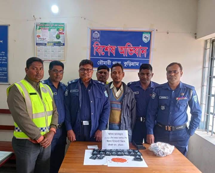 কুড়িগ্রাম জেলার রৌমারী থানা পুলিশের একটি চৌকস টিম অদ্য ২৯ জানুয়ারি ২০২৫ তারিখ সকাল আনুমানিক ১১:৩০ ঘটিকায় রৌমারী থানাধীন রৌমারী বাজার গোলামোড় এলাকা থেকে রৌমারী যাদুরচর এলাকার মাদক কারবারি মোঃ সাইদুর রহমান (৪৫) কে ৩ হাজার ৮০০ পিস ইয়াবা সহ হাতেনাতে গ্রেফতার করে।