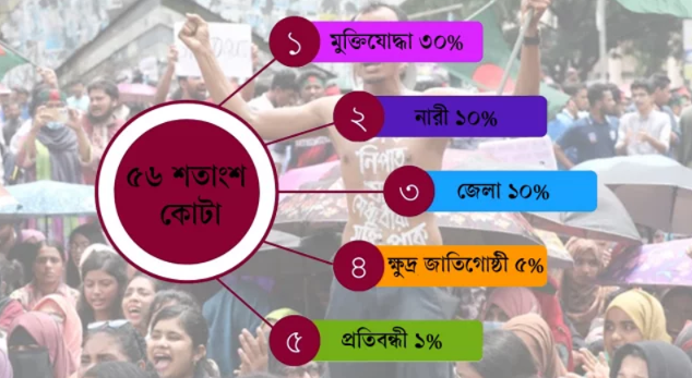 বাংলাদেশের সরকারি চাকরিতে ৫৬% কোটা বরাদ্দ রয়েছে। এই কোটার ভাগাভাগি নিম্নরূপ: