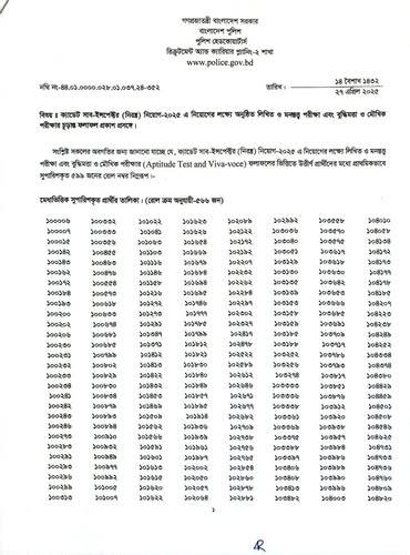 বাংলাদেশ পুলিশের ক্যাডেট সাব-ইন্সপেক্টর (নিরস্ত্র) নিয়োগ-২০২৫ এ নিয়োগের লক্ষ্যে লিখিত ও মনস্তত্ত্ব পরীক্ষা এবং বুদ্ধিমত্তা ও মৌখিক পরীক্ষার ফলাফলের ভিত্তিতে উত্তীর্ণ প্রার্থীদের মধ্যে প্রাথমিকভাবে সুপারিশকৃত প্রার্থীদের রোল নম্বর