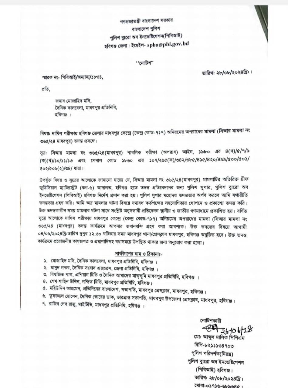 নোটিশে আগামী মঙ্গলবার (৪ সেপ্টেম্বর) মাধবপুর থানায় দুপুর ১২ টায় উপস্থিত হয়ে ওই সাংবাদিকদের কাছে থাকা নকল সংক্রান্ত সকল তথ্য ও উপাত্ত দেয়ার জন্যে মামলার হবিগঞ্জ পিবিআইয়ের তদন্ত কর্মকর্তা ইন্সপেক্টর আব্দুল মালিক পিপিএম আহবান জানিয়েছে।