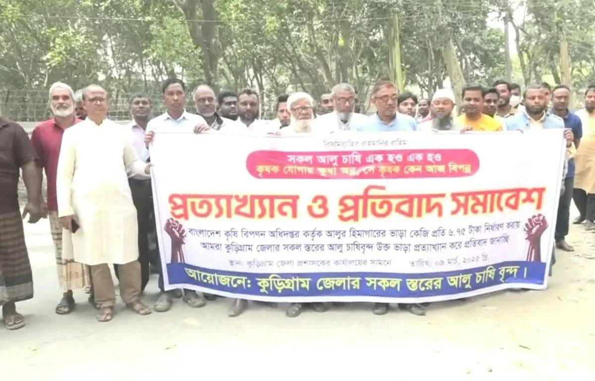 কোল্ড স্টোরেজের ভাড়া বৃদ্ধির প্রতিবাদে কুড়িগ্রামে বিক্ষোভ সমাবেশ করেছে আলু চাষিরা। রোববার (৯ মার্চ) দুপুরে কুড়িগ্রাম জেলা প্রশাসনের কার্যালয়ের সামনে এ বিক্ষোভ অনুষ্ঠিত হয়। এ সময় বক্তব্য রাখেন আলু চাষি আব্দুস ছালাম ব্যাপারী, আবুল কাশেম দুলাল, শাহ্ আলম মোস্তফা, সোলায়মান আলী প্রমুখ।