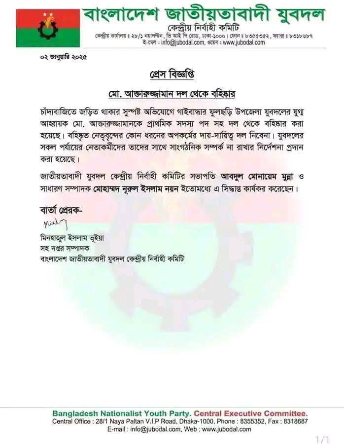 চাঁদাবাজির অভিযোগে গাইবান্ধার ফুলছড়ি উপজেলা যুবদলের যুগ্ম আহ্বায়ক মো. আক্তারুজ্জামানকে প্রাথমিক সদস্য পদসহ দল থেকে বহিষ্কার করেছে জাতীয়তাবাদী যুবদল কেন্দ্রীয় নির্বাহী কমিটি।