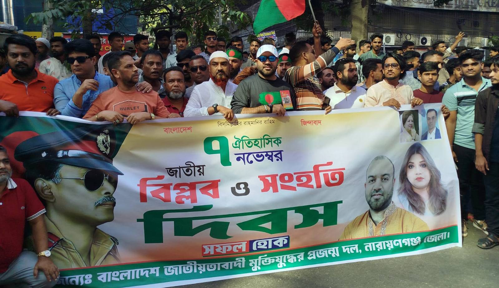 এ সময় সাংবাদিকদেও নারায়ণগঞ্জ সিটি কর্পোরেশনের সাবেক কাউন্সিলর, সিদ্ধিরগঞ্জ থানা বিএনপি’র সহ সভাপতি ও জাতীয়তাবাদী মুক্তিযুদ্ধ প্রজম্ম দলের কেন্দ্রীয় যুগ্ন সম্পাদক গোলাম মুহাম্মাদ সাদরিল বলেন, বাংলাদেশ জাতীয়তাবাদী দলের মহান বিপ্লব ও সংহতি দিবস উপলক্ষে আজকের এই শোভাযাত্রা। এতে আমরা এটিই প্রমাণ করব যে, বাংলাদেশে সবচেয়ে বড় রাজনৈতিক শক্তি হচ্ছে জাতীয়তাবাদী দল বিএনপি। ৭ নভেম্বর বিপ্লব ও সংহতি আন্দোলনের নেতৃত্ব দিয়েছিলেন বহুদলীয় গণতন্ত্রের প্রবর্তক জিয়াউর রহমান। তিনি বলেন, ৭ নভেম্বরের আগে খালেদ মোশাররফ এক অভ্যুত্থান করে। তারপরই জিয়াউর রহমান দেশের সার্বভৌমত্ব ফিরিয়ে আনতে ৭ নভেম্বর সিপাহী-জনতাকে নিয়ে এ আন্দোলন করে দেশকে মুক্ত করেন। যেভাবে ৭ নভেম্বর বাংলাদেশের হাল ধরেছিলেন শহীদ প্রেসিডেন্ট জিয়াউর রহমান, সেভাবে হাল ধরেন বেগম খালেদা জিয়া। এখন হাল ধরেছেন তারেক রহমান।