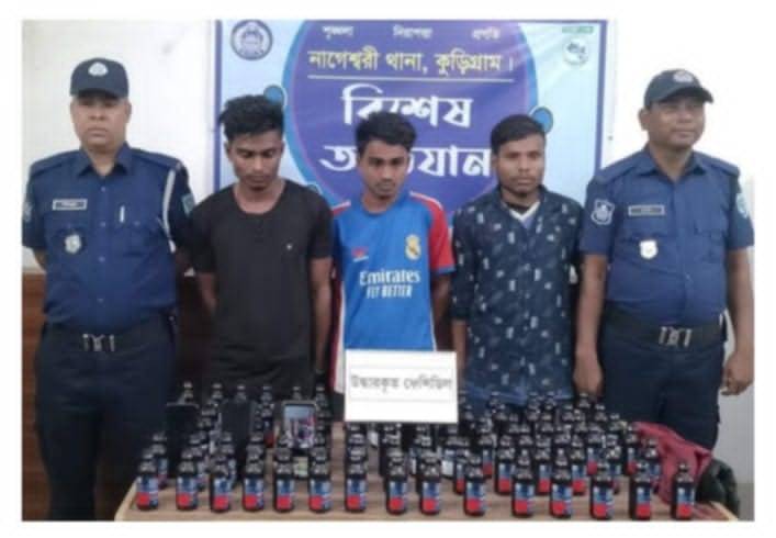 কুড়িগ্রাম জেলার নাগেশ্বরী থানা পুলিশের একটি চৌকস টিম গত ৬ নভেম্বর ২০২৪ তারিখ রাত আনুমানিক ০৯:৩৫ ঘটিকায় গোপন সংবাদের ভিত্তিতে নাগেশ্বরী থানাধীন নাখারগঞ্জ বাজার এলাকায় মাদক বিরোধী বিশেষ অভিযান পরিচালনা করার সময় একটি ব্যাটারি চালিত অটো থামানোর সিগনাল দিলে পুলিশের উপস্থিতি টের পেয়ে ০৩ জন অটো থেকে নেমে পালানোর চেষ্টা করলে পুলিশ তাদের আটক করে এবং তাদের ব্যাটারি চালিত অটো তল্লাশি করে ৯০ (নব্বই) বোতল ফেন্সিডিল উদ্ধার ও অটো জব্দসহ হাতেনাতে গ্রেফতার করে।