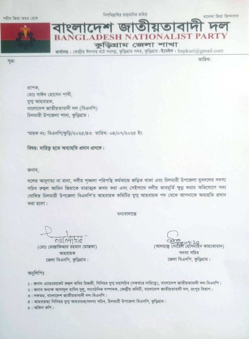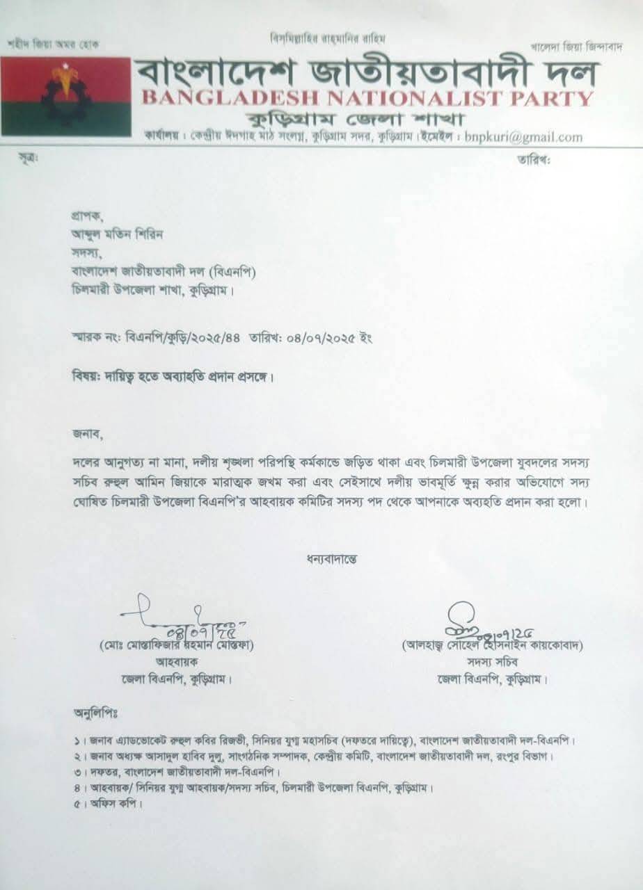 বিজ্ঞপ্তিতে বলা হয়েছে, দলের আনুগত্য না মানা, দলীয় শৃঙ্খলাপরিপন্থি কর্মকাণ্ডে জড়িত থাকা এবং চিলমারী উপজেলা যুবদলের সদস্যসচিব রুহুল আমিন জিয়াকে মারাত্মক জখম করা এবং সেই সঙ্গে দলীয় ভাবমূর্তি ক্ষুণ্ন করার অভিযোগে সদ্য ঘোষিত চিলমারী উপজেলা বিএনপির আহ্বায়ক কমিটির যুগ্ম আহ্বায়ক আবু সাঈদ হোসেন পাখী এবং সদস্য আব্দুল মতিন শিরিনকে তাদের পদ থেকে অব্যাহতি প্রদান করা হলো।
