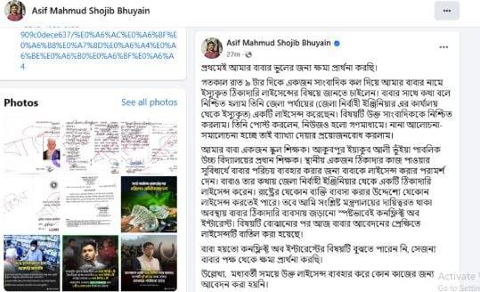 তিনি জানান, গতকাল রাত ৯টার দিকে এক সাংবাদিক তার বাবার নামে ইস্যুকৃত ঠিকাদারি লাইসেন্স বিষয়ে জানতে চান। বিষয়টি জানার পর তিনি বাবার সঙ্গে কথা বলেন এবং নিশ্চিত হন যে, জেলা নির্বাহী প্রকৌশলীর কার্যালয় থেকে একটি ঠিকাদারি লাইসেন্স সংগ্রহ করেছেন তার বাবা।