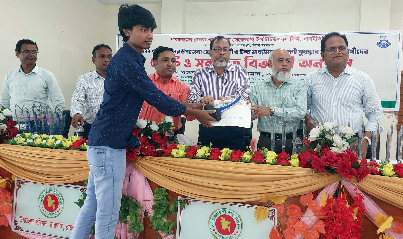 শিক্ষা মন্ত্রালয়ের মাধ্যমিক ও উচ্চ শিক্ষা অধিদপ্তরর এর পারফরমেন্স বেজড গ্রান্টস ফর সেকেন্ডারী ইন্সটিটিউশনস স্কিম, এসইডিপির আওতায় এই অনুষ্ঠানের আয়োজন করা হয়। বৃহস্পতিবার (৩১ জুলাই) সকালে উপজেলা পরিষদ হলরুমে পুরুস্কার বিতরন অনুষ্ঠানে উপজেলা একাডেমিক সুপারভাইজার রাহিদুল ইসলাম এর সঞ্চালনায় সভাপতিত্ব করেন উপজেলা নির্বাহী কর্মকর্তা জান্নাতুল ফেরদৌস, প্রধান অতিথি হিসেবে বক্তব্য রাখেন মাধ্যমিক ও উচ্চ শিক্ষা, রাজশাহী অঞ্চলের পরিচালক অধ্যাপক মোহা: আছাদুজ্জামান। পুরস্কার বিতরনী অনুষ্ঠানে এসময় উপস্থিত ছিলেন মাধ্যমিক ও উচ্চ শিক্ষা রাজশাহী অঞ্চলের সহকারী পরিচালক (কলেজ) আলমাছ উদ্দিন, জেলা শিক্ষা অফিসার আব্দুল ওয়াহাব, উপজেলা মাধ্যমিক শিক্ষা অফিসার (অ:দা) মোতাহার হোসেনসহ মাধ্যমিক ও উচ্চ মাধ্যমিক প্রতিষ্ঠানের প্রধান শিক্ষক, ম্যানেজিং বডি সভাপতি,অভিভাবক ও মেধাবী ছাত্র-ছাত্রীবৃন্দ।