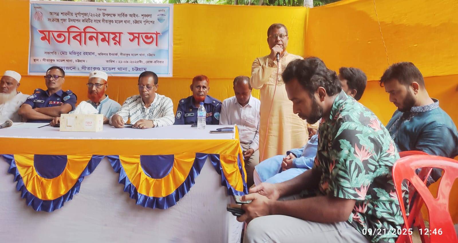 সীতাকুণ্ড মডেল থানার ওসি মোঃ মজিবুর রহমানের সভাপতিত্বে অনুষ্ঠিত মত বিনিময় সভায় বক্তব্য রাখেন উপজেলা বিএনপির আহবায়ক ডাক্তার কমল কদর, পৌরসভা বিএনপির আহবায়ক জাকির হোসেন,উপজেলা বিএনপির সদস্য সচিব কাজী মহিউদ্দিন,জামায়াতে উপজেলা সেক্রেটারী মোঃ তাহের, সাবেক কমিশনার ও বিএনপি নেতা সামছুল আলম আজাদ,জামায়াত পৌর সভাপতি আলী আকবর,পৌর সদর ব্যবসায়ী সমিতির সভাপতি মোঃ নাসির উদ্দিন,পৌর বিএনপির সদস্য সচিব সালেহ আহমদ সলু, পৌর জামায়াতের সেক্রেটারী,,, উপজেলা পুজা কমিটির সভাপতি অমলেন্দু কনক,সাধারণ সম্পাদক বাবু বীর বাহাদুর,শাশ্রী, ইন্জিঃ ব্রজ্যধাম জলদাশ সহ বিভিন্ন মন্দরের নেতৃবৃন্দ বক্তব্য রাখেন।