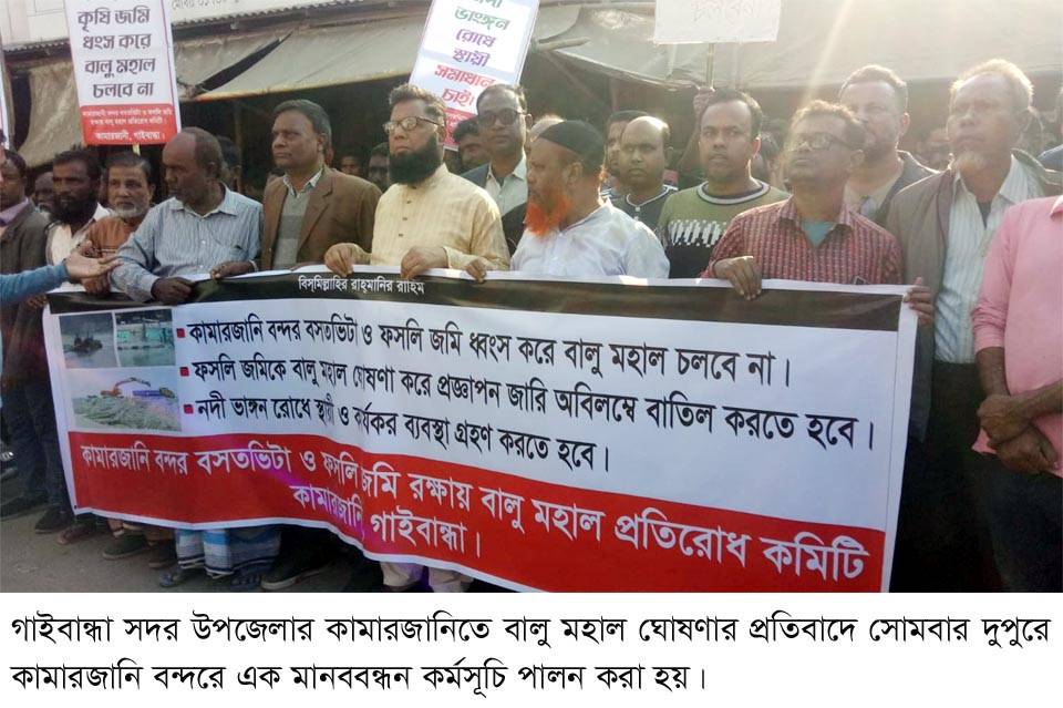 গাইবান্ধা সদর উপজেলার কামারজানি বন্দর, বসতভিটা, ফসলি জমি রক্ষা ও বালু মহাল ঘোষণার প্রতিবাদে সোমবার দুপুরে কামারজানি বন্দরে এক মানববন্ধন কর্মসূচি পালন করা হয়। কামারজানি বন্দর বসতভিটা ও ফসলি জমি রড়্গায় বালু মহাল প্রতিরোধ কমিটি এই মানববন্ধনের আয়োজন করে।