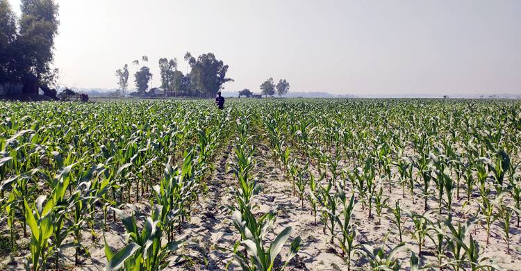 জেলা সদরের ভোগডাঙ্গা ইউনিয়নের চরমাধবরাম এলাকায় ধরলা নদীর অববাহিকায় বহু একর জায়গা জুড়ে ভুট্টা খেত। মাঠের পর মাঠ এতো সুবিশাল সবুজের সমাহারে নয়ন জুড়িয়ে যায়। খেতগুলোতে পরিচর্যায় কৃষকেরা ব্যস্ত সময় পাড় করছেন।